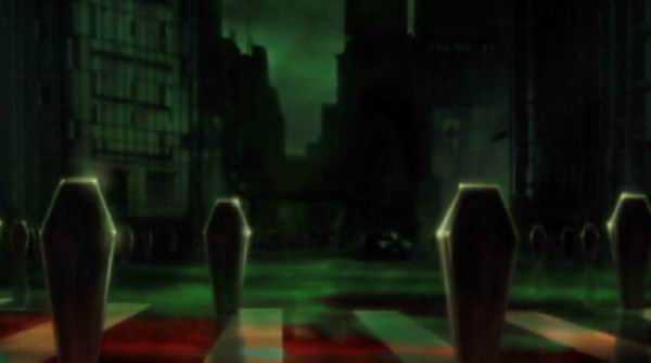 P3里异世界的设定内含浓厚的“后1995”情结,故事设定每一天的时间并非平滑相连的,在日与日交接的0点存在一个现实世界不能感知到的“影时间”,活跃于其中的“阴影”(shadow)攻击误入影时间的人类,造成受害者在现实世界中罹患“无气力症”。除了少数具有适应力的人,普通人在影时间中都会“象征化”,在P3里象征化的外在呈现形式是矗立的棺木。棺木既用于保护身在其中的人不被阴影袭击,也造成人与人被迫分离,各自独处于逼仄的空间内。“宁可孤独地被分隔也要寻求微末保护”的心理,显示出后1995时代日本民众的集体焦虑,从天而降无法控制的灾难(倪克斯降世/阪神大地震)和日常生活空间里潜在的威胁(阴影/奥姆真理教)剥夺了他们的安全感,尤其是后者塑造出一种“敌人隐藏在我们中间”的叙事,妨碍了人与人间的联系。