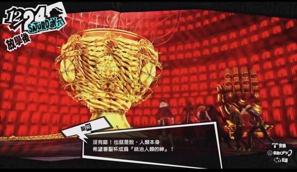 在精神分析学说的延长线上走过了大半流程后,P5的末端忽然融入了边沁、福柯以及韩炳哲的哲学和政治学思想。前期和中期提供给玩家刷经验和人格面具的“印象空间”(メメントス,Mementos)地位翻转变成了“真正的主线”。印象空间是一个异化了的破败现实世界,初入印象空间时它所起的作用是承载支线,游离于主线攻略殿堂之外。主角在其中游荡,空间模糊混乱不断变化。混乱、破败、没头没尾、不知终点在何处,这正是民众的深层集体心理映射出的现实——后现代的世界。印象空间的入口涩谷地铁站,本身也是一个强大的文化符号。涩谷所代表的文化意义是消费主义的盛行,它的繁荣标志着日本经济发展转折。人们劳动的目标不再是有朝一日终将到来的乐园,而是体面地消费。以涩谷地铁站为中心、以东京地下铁路为管道的印象空间不断深入,直达深埋于民众内心深处的潜意识——它的终点环形监狱和圣杯,象征对未来失去希望的民众渴望一个代表正义的“大叙事”去追随。自由意味着做出选择并承担随之而来的后果,因此自由是沉重的。只要有“圣杯”引导,大家便可以放弃思考、遵从命令,缓解对后现代社会的适应不良症。于是在印象空间深处民众的阴影主动乘上通往监狱的列车,自愿被囚禁在环形监狱、为圣杯输血。