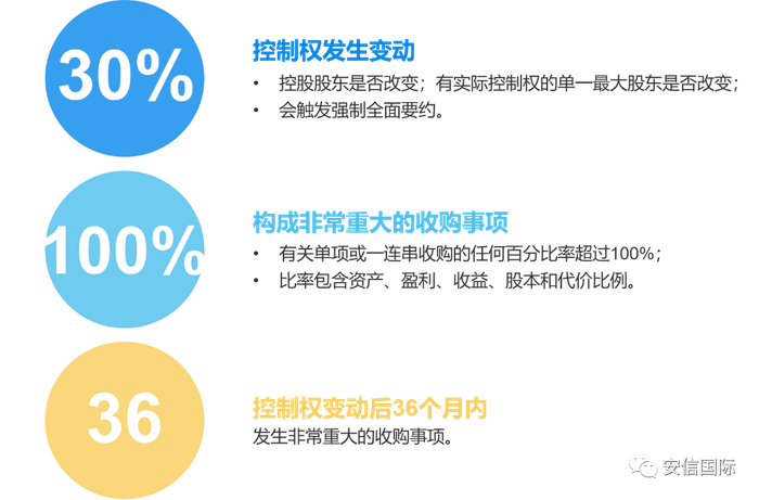 值得注意的是,如果控制权变更后的36个月刚过,就提出收购新业务的交易,该交易可能会被认为在36个月内就已开始筹划,也可能会被视为RTO。