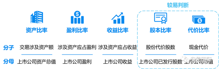 关于重大收购事项的计算,是将收购交易涉及的数据除以上市公司的数据所得百分比,若任意一项的结果大于100%,即属于重大收购事项。其中,代价比率和股本比率比较容易判断。