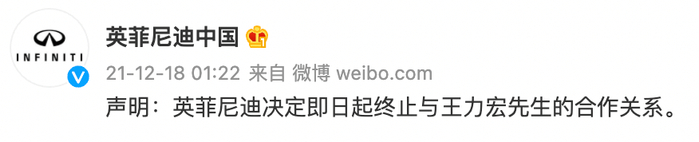 12月18日凌晨,国际知名汽车品牌英菲尼迪成为了首个与王力宏解约的企业,通过官微发文终止与王力宏的合作关系。