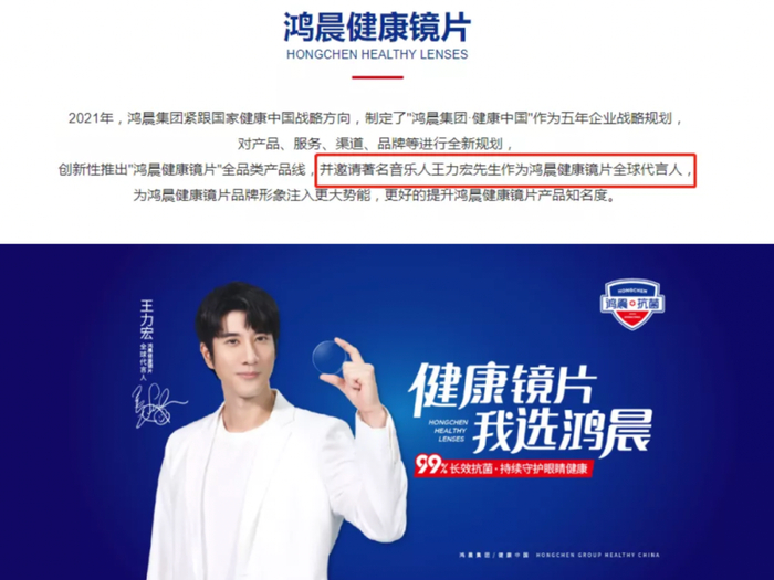 北京商报记者发现,在王力宏代言品牌中,知名镜片企业江苏鸿晨集团有限公司(以下简称“鸿晨集团”)也是精准踩雷,今年3月刚刚高调签约王力宏