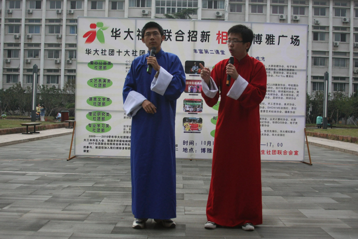 相声那会儿在南方没现在这么火。我上大学的时候就把自己说相声的特长发扬了一下,跟几个志同道合的同学一起创办了华中师大第一个相声社团。后来还成了学校三大剧社之一的晨雨剧社的社长。