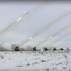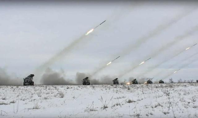 奥伦堡附近军事演习中的俄罗斯车载火箭发射器