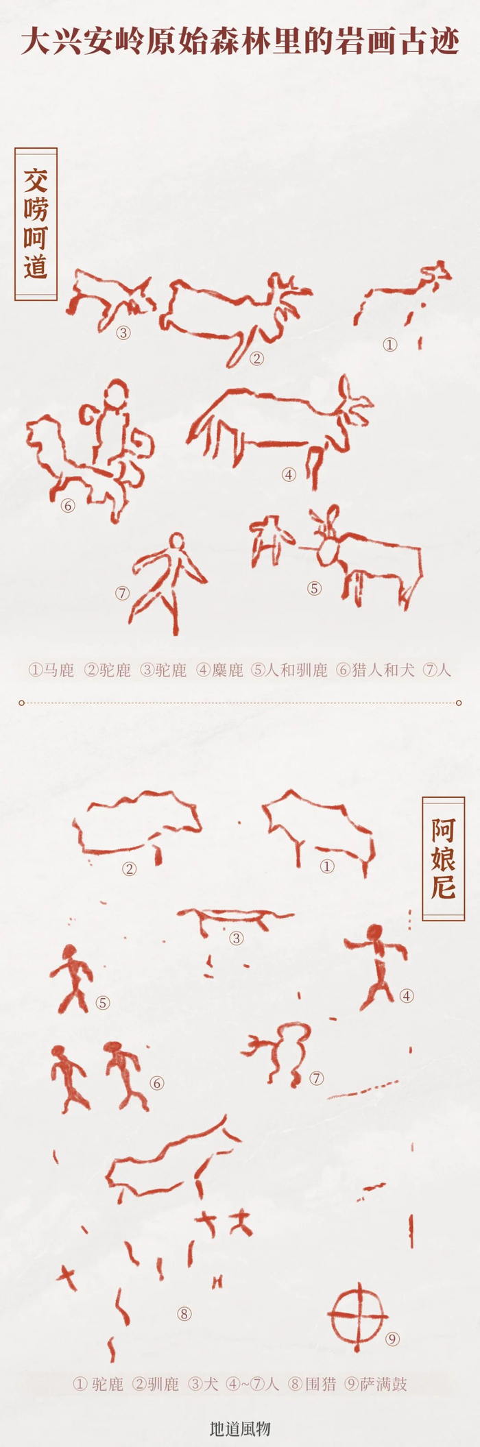 大兴安岭中隐藏的44处岩画(黑龙江境内29 处、内蒙古境内15处,单幅岩画多达3000幅)便与东北古族群的衍生丝丝相扣,这些由赭石绘就的岩画描绘了围猎、敬神、万物崇拜与萨满三界等场景。
