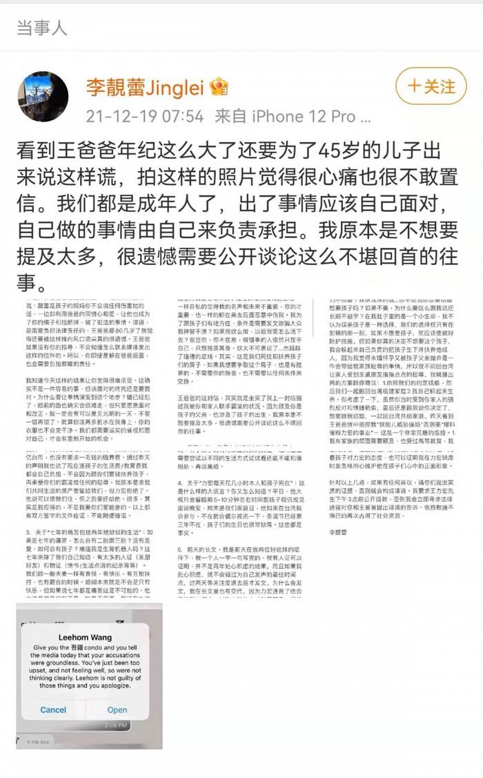 12月19日,李靓蕾在社交平台发文反击王力宏爸爸的手写信,称:“看到王爸爸年纪这么大了还要为了45岁的儿子出来说这样谎,拍这样的照片觉得很心痛也很不敢置信。”对于王爸爸的手写信内容,李靓蕾一一回应。并表示,要求王力宏下午3点前公开道歉,否则将采取法律手段。
