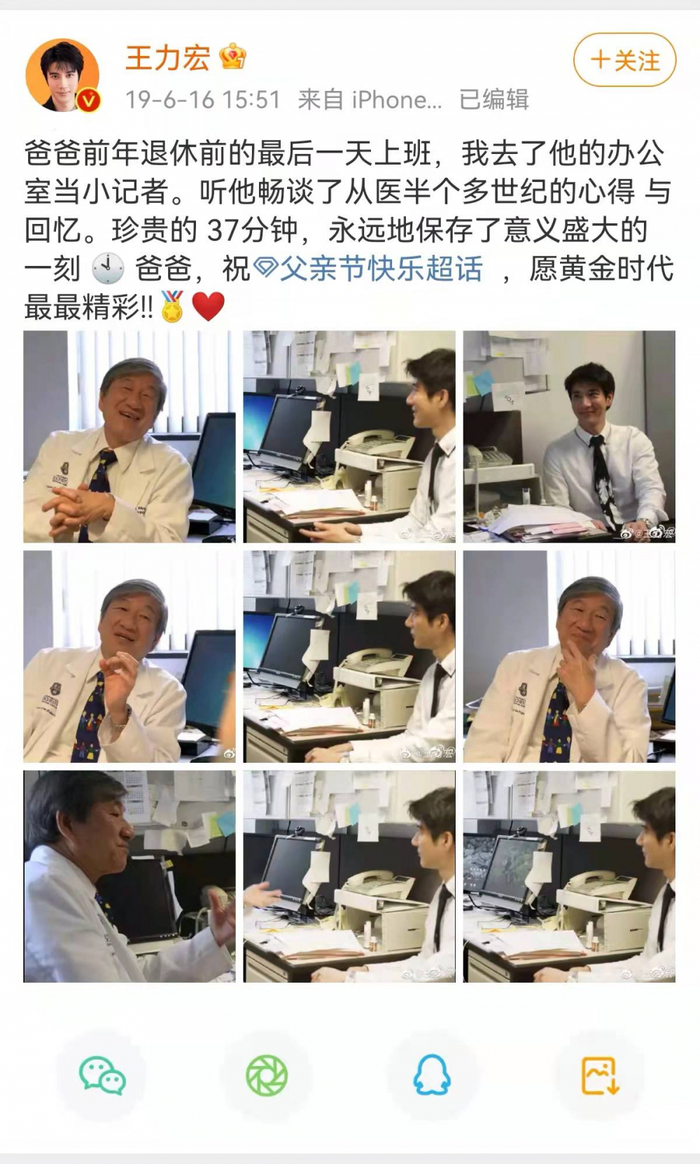 据媒体报道,王力宏的父亲王大中毕业于台湾大学医学系,是一名脑科医生。上游新闻记者从王力宏的微博中看到,2019年,王力宏曾发微博称“爸爸前年退休两人畅聊”,配图是其父亲身着白大褂,坐在办公室说话的画面。