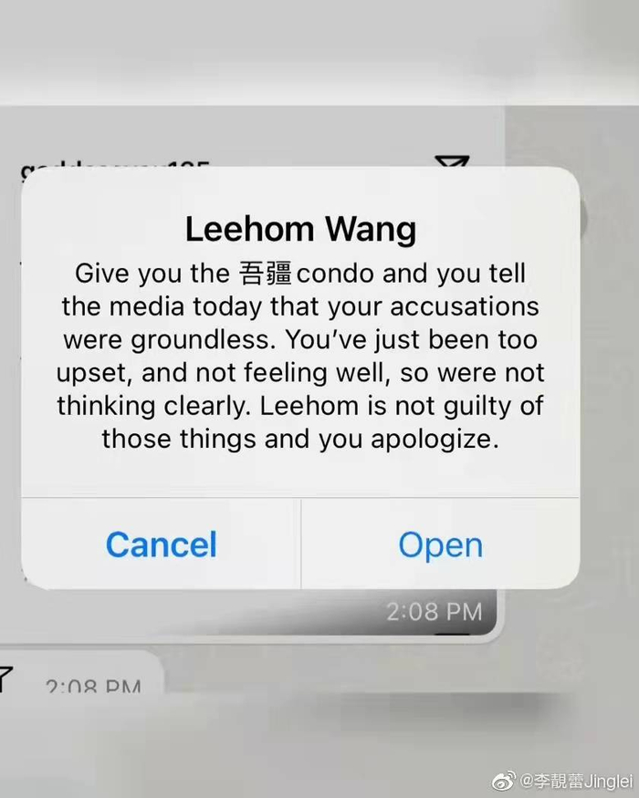 3、王力宏发信息给李靓蕾,信息内容是如果李靓蕾发声明道歉并称此前是神志不清发的文,就把豪宅“吾疆”给她;