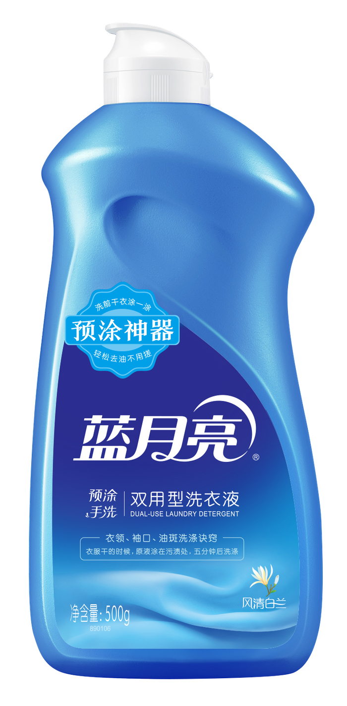 在去渍实验进行前,先将蓝月亮预涂手洗双用型洗衣液在污渍处进行预涂,静置五分钟后投入洗衣机,再加入蓝月亮至尊洗衣液。