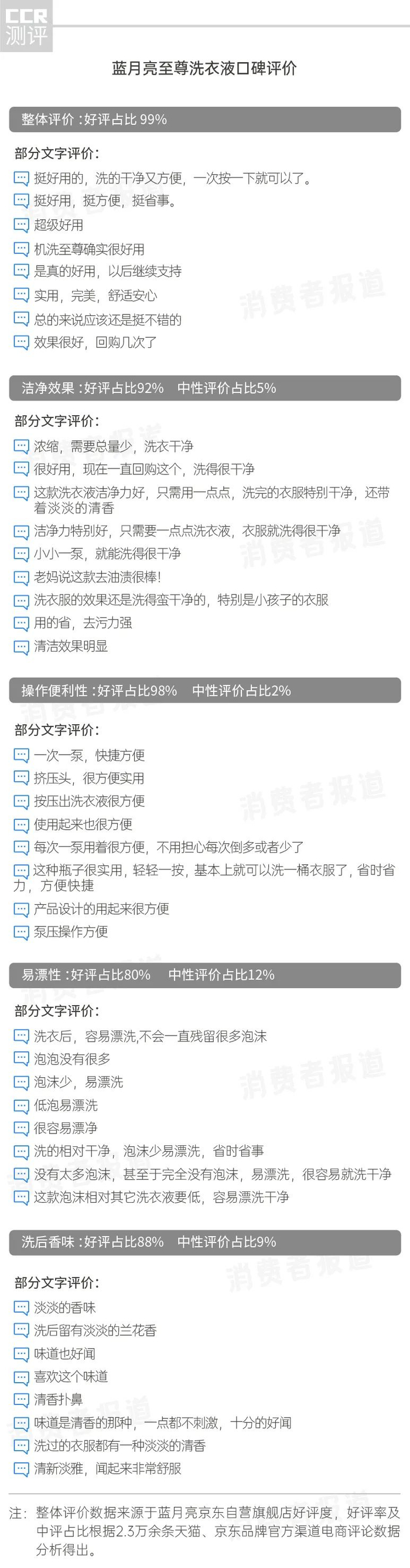 经《消费者报道》对京东、天猫品牌官方渠道2.3万余条电商评论数据的分析,结果显示,蓝月亮至尊洗衣液的整体满意度十分高,好评占比达99%,不少用户评论道“效果很好,回购几次了”“ 是真的好用,以后继续支持”等。