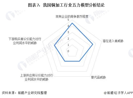 根据以上分析,对铜加工行业各方面的竞争情况进行量化,5代表最大,0代表最小,我国铜加工行业的竞争情况如下图所示。