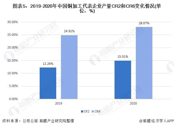 从我国铜加工行业市场集中度来看,2020年铜加工代表企业产量CR2的值为15.01%,相较于2019年增长了2.78个百分点;2020年铜加工产量CR6的值为28.07%,相较于2019年增长了3.16个百分点。总的来看,铜加工行业的集中度有一定程度的提高。