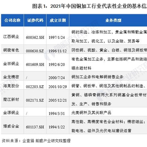 铜加工行业产品又称为铜加工材,是指由铜及铜合金制作出的各种形状的铜材,如铜板、铜带、铜线、铜排、铜管、铜棒、铜箔等,目前我国是世界上铜产品最丰富的国家之一。我国铜加工行业的代表性企业有江西铜业(600362)、铜陵有色(000630)、金田铜业(601609)、海亮股份(002203)、楚江新材(002171)、金源铜业、博威合金(601137)、精艺股份(002295)、鑫科材料(600255)、金龙精密等。