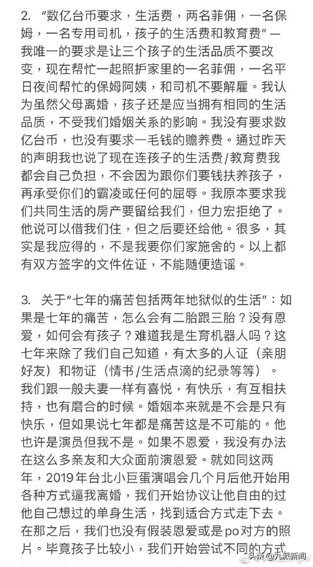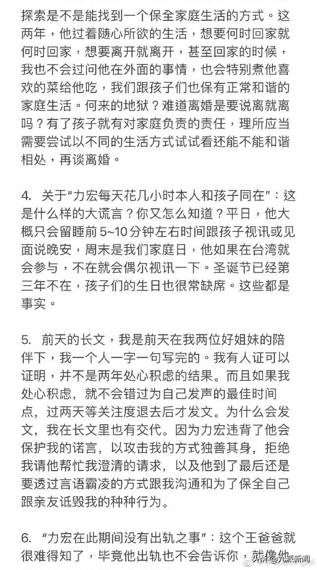 称自己结婚之后大部分时间不是在备孕怀孕就是在产后哺乳育儿,并且都是自己独自面对,而王力宏则在家庭中缺位,自己过着“伪单亲”的生活。