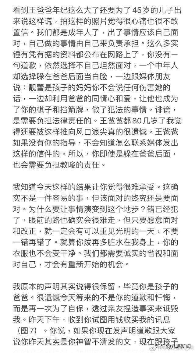 对此,李靓蕾社交平台再发文:“看到王爸爸年纪这么大了还要为了45岁的儿子出来说这样谎,拍这样的照片觉得很心痛也很不敢置信。”并喊话王力宏出了事情应该自己面对,自己做的事情由自己来负责承担。她还表示:“我原本是不想要提及太多,很遗憾需要公开谈论这么不堪回首的往事。 ”