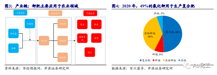 钾肥为基础肥料之一。钾肥是指一种以钾(K)元素为最主要成分的农用肥料,能增强农作物的抗旱、抗盐、抗倒伏能力等功能。钾肥按照含氯与否划分,可分为氯化钾和其他诸如硫酸钾、硝酸钾、硫酸钾镁等不含氯的钾肥品种。根据百川盈孚数据,2020年49%的氯化钾用于生产复合肥,38%用于生产其他钾盐,8%用于种植,5%用于其他领域。氯化钾成本较低,养份浓度高,是钾肥的主要种类。另外,氯化钾还可以用于其他钾盐生产以及橡胶、电镀、医药等行业。氯化钾产业链上游钾石盐、盐湖等原料和浮选剂,下游主要为农业、林业、医药等领域。