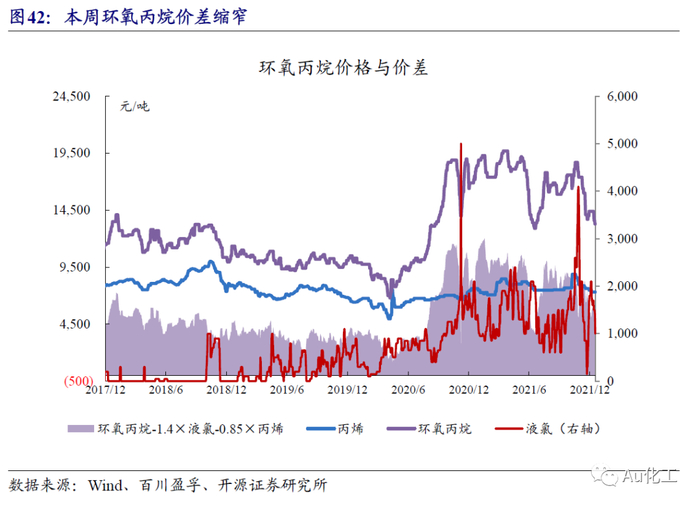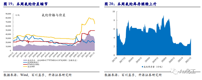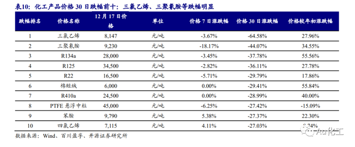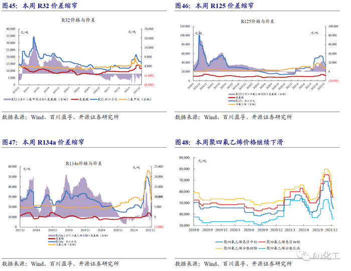 成本端,萤石高位盘整,氢氟酸、氯化物价格有所回落。(1)萤石、氢氟酸方面,本周(12月13日-12月17日)萤石价格高位整理,据百川盈孚数据,当前97%萤石湿粉的主流价格在2,700-2,950元/吨。近期无水氟化氢开工率有所回升,价格所回落,企业开工积极,对萤石的需求支撑尚存。部分地区受环保监督、疫情以及降温等因素的影响,萤石企业开工率有所下滑;北方地区冬季受降温的影响,开工与库存双底,厂家挺价意愿强烈。国内萤石现货供应紧张局面短期内无明显改善,但下游氢氟酸价格下跌,预计短期萤石高位整理运行。(2)三氯乙烯方面,本周(12月13日-12月17日)三氯乙烯价格下调,据百川盈孚数据,累计调整幅度在100-500元/吨。本周三氯乙烯西北个别厂家开工略有下调,供应面稍有缩减,但在下游制冷剂整体需求疲软难改的情况下,难以对目前跌势市场起到支撑作用。当前山东地区三氯乙烯散水送到报价8000-8200元/吨左右,个别厂家暂不报价;西南地区三氯乙烯散单散水送到报价8000-8200元/吨;西北地区三氯乙烯散单散水送到报价8200元/吨。(3)四氯乙烯方面,本周(12月13日-12月17日)四氯乙烯市场价格小幅增加。目前山东地区四氯乙烯企业散水出厂价格维持在6900元/吨左右;江浙地区个别四氯乙烯散水出厂价格维持在7000元/吨;西南地区四氯乙烯 企业散水出厂价格维持在6900元/吨左右。据百川盈孚数据,四氯乙烯样本企业整体有效运行产能约为21万吨,开工率维持在73.0%,预计山东个别厂家预计一月有停车检修计划,受疫情影响,浙江四氯乙烯部分企业发货受阻,减负生产。(4)二氯甲烷方面,本周(12月13日-12月17日)国内二氯甲烷市场持续上行,需求有所回暖。据百川盈孚数据,本周二氯甲烷山东市场均价5141.6元/吨,较上周均价上涨242.46元/吨,江浙一带二氯甲烷均价5535元/吨,较上周均价上涨434.57元/吨,华南一带4850元/吨,较上周均价上涨178.57元/吨。