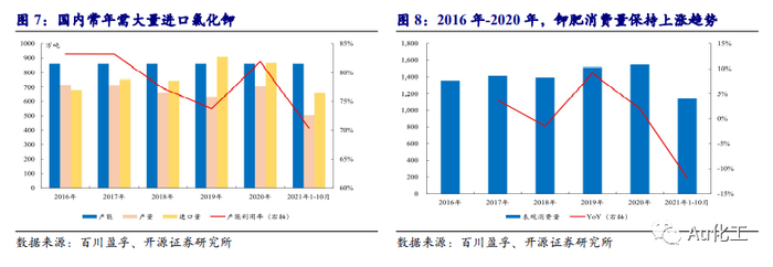 中国钾肥供需不平衡,常年高度依赖进口。根据百川盈孚数据,2016年以来,我国氯化钾产能维持在860万吨的水平。2020年我国氯化钾产量为704万吨,但进口量却达到了866万吨。我国钾肥生产能力有限,国产钾肥自给率不足60%。2020年,我国氯化钾的表观消费量为1,549万吨,同比+1.99%。我国作为一个农业种植与消费大国,对钾盐的需求位居世界前列。氯化钾的供需不匹配,导致我国常年需要进口大量的氯化钾。