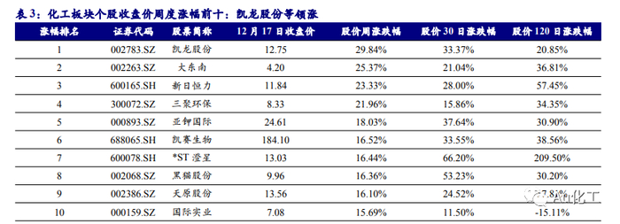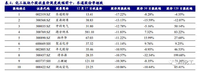 本周化工板块的405只个股中,有183只周度上涨(占比45.19%),有218只周度下跌(占比53.83%)。7日涨幅前十名的个股分别是:凯龙股份、大东南、新日恒力、三聚环保、亚钾国际、凯赛生物、*ST澄星、黑猫股份、天原股份、国际实业;7日跌幅前十名的个股分别是:乐通股份、星源材质、中科电气、德方纳米、翔丰华、聚石化学、丰元股份、清水源、三棵树、湖北宜化。