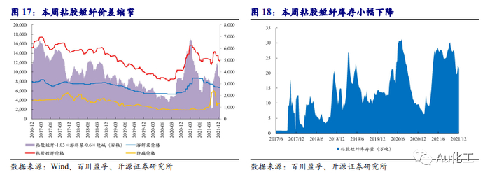 粘胶短纤:本周(12月13日-12月17日)粘胶短纤价格下跌,库存稍降。本周粘胶短纤市场暂稳运行,市场主流成交价无明显变化。本周国内粘胶短纤均价为 12750 元/吨承兑,较上周均价下跌 0.28 %。供应端,本周河北地区开工提升,宜宾装置因环保原因停产一条生产线,九江装置检修,行业整体负荷降低。截至12月16日,行业开工率为73.58%。需求端,下游淡季表现明显。人棉纱市场延续弱势,交投氛围冷清,企业以消耗库存原料为主。库存方面,本周行业库存少量下降,根据百川盈孚数据,本周粘胶短纤库存为21.05万吨,较上周下降3.95%。受益标的:三友化工。