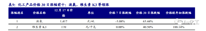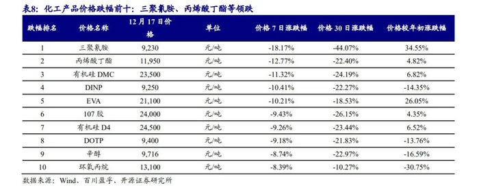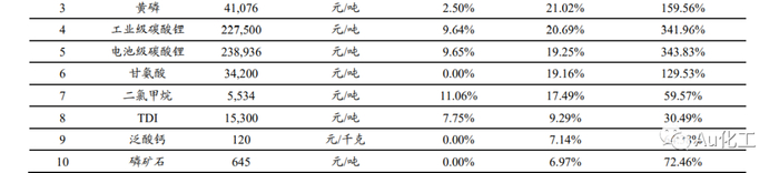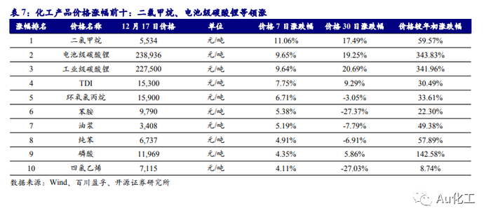 3.1、本周化工品价格涨跌排行:二氯甲烷、电池级碳酸锂等领涨