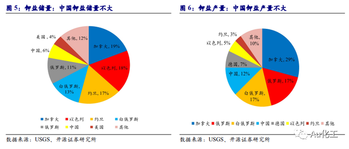 中国钾盐资源储量和产量不大。储量方面,根据USGS数据,截至2020年,全球钾盐探明储量(K2O当量)约57亿吨,全球钾盐资源储量前五的国家分别为是加拿大、以色列、约旦、白俄罗斯、俄罗斯,分别占比19%、18%、17%、13%、11%。而中国位列第六,我国钾盐的储量为3.5亿吨,占比仅为6%。目前国内探明的矿产地共计40多处,主要分布在青海、新疆、西藏、云南、山东、甘肃等地。产量方面,根据USGS数据,2020年全球钾盐的矿产品产量达到4,300万吨,其中加拿大是最大的钾盐矿产品生产国,产量为1,400万吨,占全球产量的29%。紧随其后的为白俄罗斯和俄罗斯,两者钾盐产量的全球占比均达到17%。全球钾盐生产高度集中,CR3达63%。中国钾盐矿产品产量约500万吨,位列第4,占全球12%。我国钾盐资源储量相对匮乏,产量亦较低。
