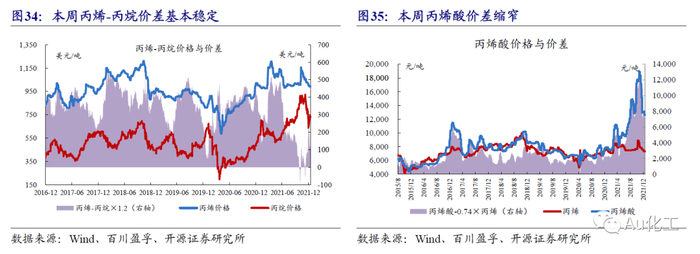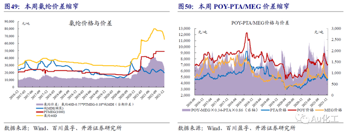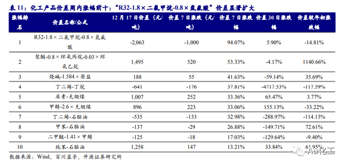 近7日我们跟踪的72种产品价差中,有33种价差较上周上涨,有27种下跌。7日涨幅前五名的价差是:“R32-1.8×二氯甲烷-0.8×氢氟酸”、“聚醚-0.8×环氧丙烷-0.03×环氧乙烷”、“烧碱-1.584×原盐”、“丁二烯-丁烷”、“尿素-无烟煤”;7日跌幅前五名的价差是:“尿素-1.5×无烟煤”、“三聚磷酸钠-0.26×黄磷”、“丙烯酸丁酯-0.59×丙烯酸-0.6×正丁醇”、“有机硅DMC-1.16×甲醇-0.48×金属硅”、“R22-1.5×三氯甲烷-0.53×氢氟酸”。