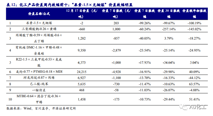 4.2、本周价差涨跌排行:“R32-1.8×二氯甲烷-0.8×氢氟酸”价差显著扩大;“尿素-1.5×无烟煤”价差跌幅明显