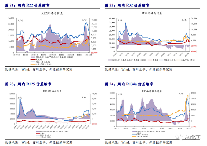 三代制冷剂价格继续回落。二代制冷剂:本周R22延续弱势,三氯甲烷、氢氟酸等成本面支撑走弱,部分厂家仍有一定配额余量,且临近新配额释放,供应方面货源较宽松。根据百川盈孚数据,截至12月17日,华东市场主流成交价格在16,000-17,000元/吨。三代制冷剂:据百川盈孚数据,12月17日R32、R125、R134a制冷剂价格分别为15,500、34,500、28,000元/吨,分别较12月10日下跌6.06%、下跌2.82%、下跌3.45%。我们认为,在为实现“碳中和”战略而将进行的各类非二氧化碳温室气体的管控中,HFCs政策预期最为明朗、路径最为清晰,随着第三代制冷剂配额管理措施逐步落地,周期反转之机逐渐临近。
