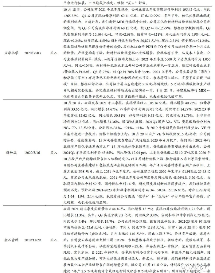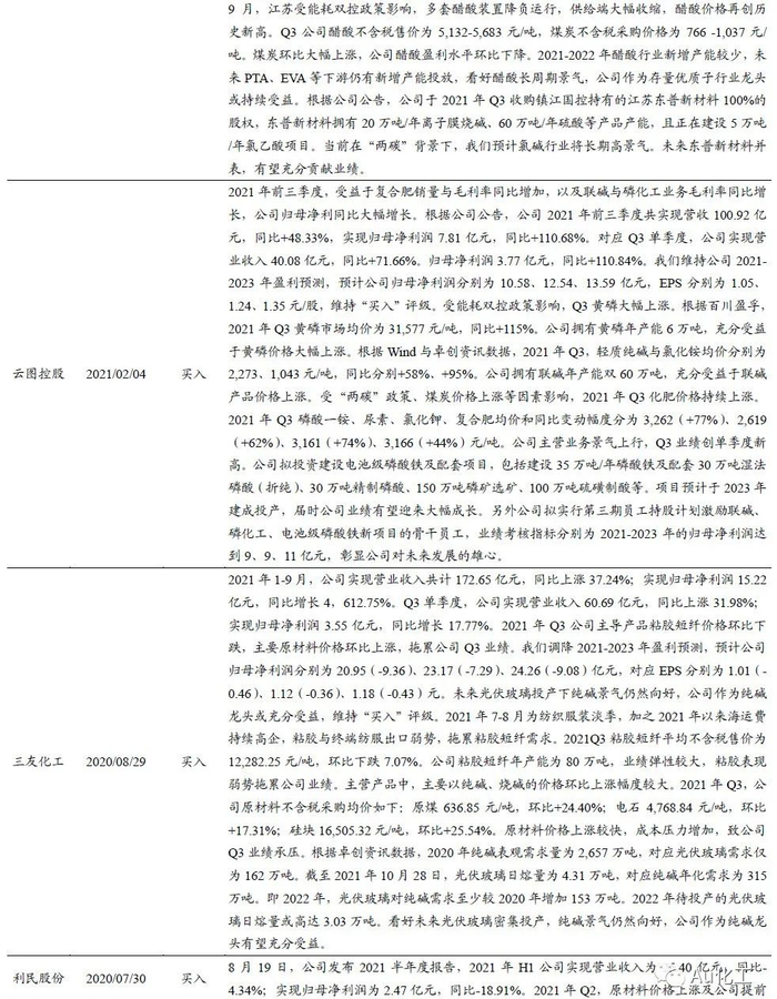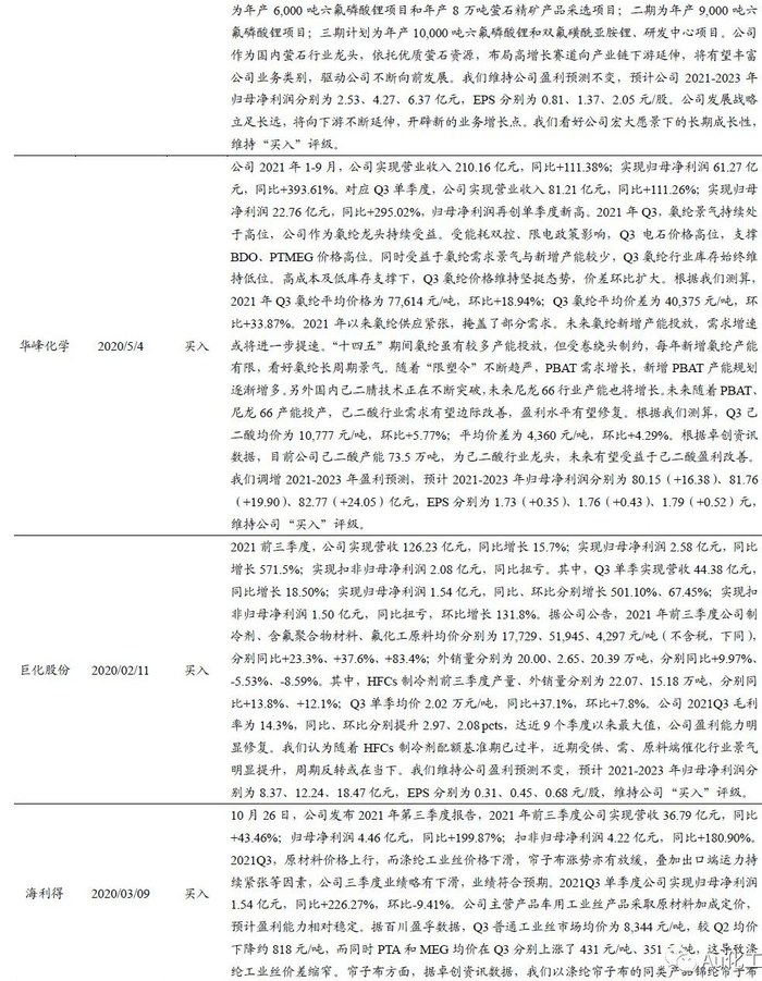 受益标的:【化工龙头白马】万华化学、华鲁恒升、恒力石化、荣盛石化、赛轮轮胎、扬农化工、新和成等;【氟化工】金石资源、巨化股份、三美股份、东岳集团、滨化股份等;【纯碱行业】远兴能源、中盐化工、山东海化、三友化工、云图控股、和邦生物等;【磷化工】云图控股、川发龙蟒、湖北宜化、川恒股份等;【硅】合盛硅业、新安股份、三友化工等;【化纤行业】新凤鸣、华峰化学、三友化工。