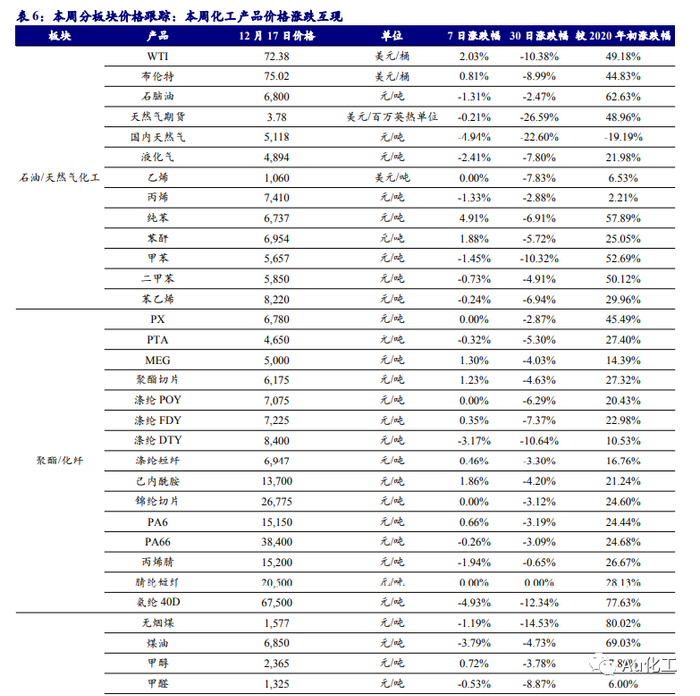 根据Wind数据,截至12月17日,聚酯产业链织造业开工率为61.02%,相比上周开工率下降-1.01%。据iFinD数据,截至12月17日,终端织造坯布库存为33.78天,较上周增加0.34天。根据Wind数据,2021年11月,美国服装及服装配饰店销售额为287.94亿美元,同比增加35.27%,较2019年同期增长14.40%,自疫情以来连续9个月大幅转正。我们认为随着海运费松动、海外刚需复苏以及补库需求仍在,在近期疫情反复情况之下,能够稳定供应全球的中国纺服产业链景气度将会回升。受益标的:【化纤组合】三友化工、新凤鸣、华峰化学、恒力石化。