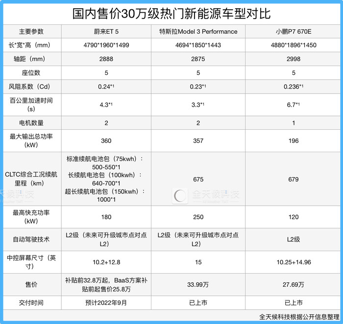 全天候科技整理国内售价30万元级热门新能源汽车资料发现,蔚来ET 5与特斯拉Model 3 Performance、小鹏P7 670E在车辆外形基础设计上参数差异不大,三者的区别主要体现在整车性能和售价方面。
