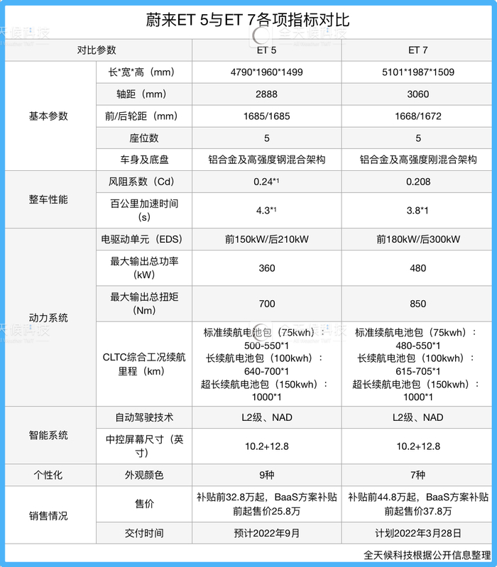 种种数据看下来,ET 5似乎亮点不少,但它综合实力到底如何呢?作为与ET 5同时在蔚来日上被提到的车型,ET 7也免不了被拿出来比较。