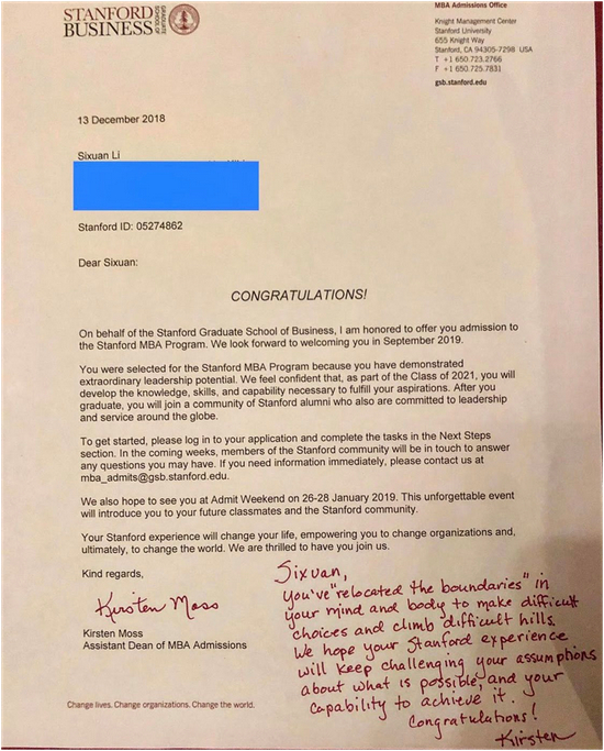 斯坦福MBA录取通知书上的录取官手写了一段内容,虽然最终选择放弃这个机会,但是她很感谢自己在申请的过程中得到的启示。