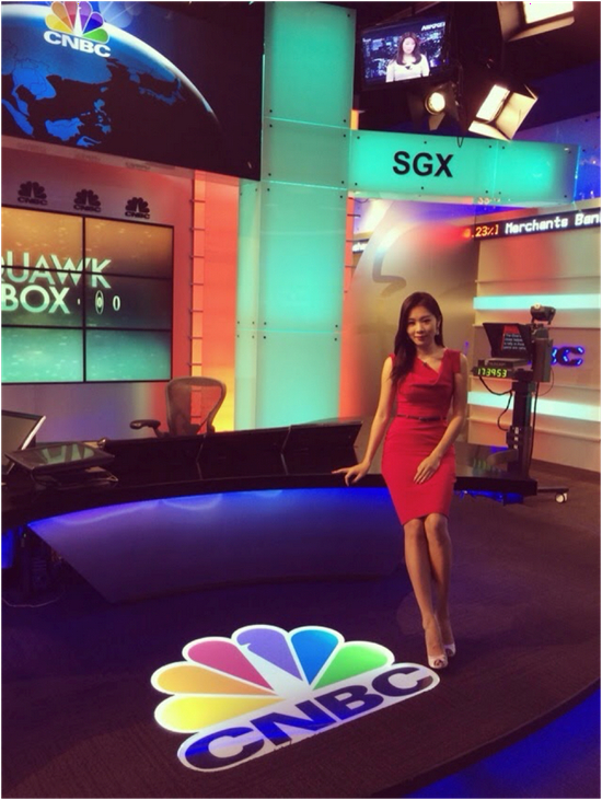新年时她主持了欧美同学会的晚会,被一个媒体猎头看到,向她抛出了著名的财经电视台CNBC亚太总部的试镜通知。面对这个结合自己金融和媒体经验的全新机会,她去试镜了,入选了,就这么放弃了KKR,去了新加坡,成为CNBC迄今为止唯一一位进行日常中英文双语播报的记者,她一方面每天要和央视财经进行连线,更挑战性的工作是每天在CNBC的亚洲全时段用英文进行亚太市场和欧洲市场的直播播报,自己看盘写稿每个小时直播。