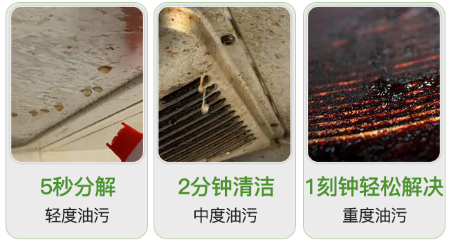 面对陈年重度油污它也没在怕的,让每天接受油腻摧残的油烟机,不到5分钟,油垢尽除堪比换新!