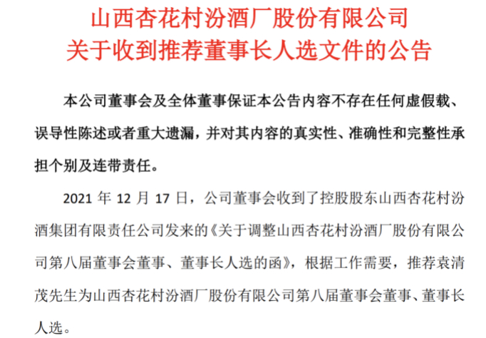 接替李秋喜担任集团及上市公司董事长职位的袁清茂来自交通系统。山西汾酒在12月19日公告中披露的履历显示,1969年出生的袁清茂,历任太原高新技术产业开发总公司总经理,山西省供销社财务处处长,山西兴合资产经营管理有限公司总经理,山西省供销合作社联合社党组成员、副主任,山西省交通厅党组成员、副厅长兼总会计师,山西交通控股集团有限公司党委书记、董事长;现任山西杏花村汾酒集团有限责任公司党委书记、董事长,山西杏花村汾酒厂股份有限公司党委书记。