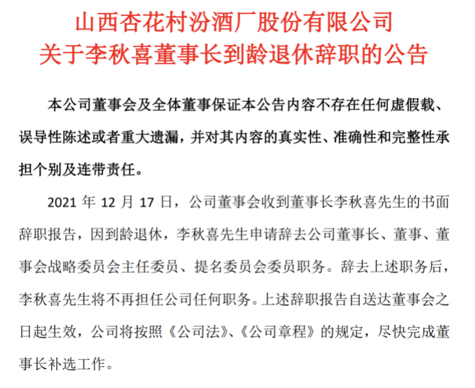 60岁的李秋喜正式卸任其在山西汾酒的所有职务。12月19日下午,山西汾酒发布公告称,因到龄退休,李秋喜申请辞去公司董事长、董事等职务,将不再担任公司任何职务。与此同时,山西汾酒发布的另一份公告显示,推荐袁清茂为第八届董事会董事、董事长人选。