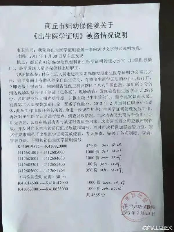 他们又去了商丘卫计委(现商丘卫健委),对方承认,他们带来的那批出生证确实是商丘地区的,而且当时签发给了商丘市妇幼保健院。到此,4885份出生证明被盗一案,虽然在当时距离案发已经5年有余,但却是首次在公共视野中露了一角。