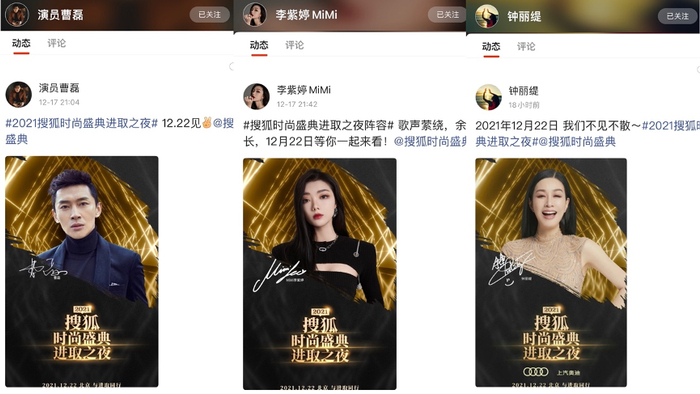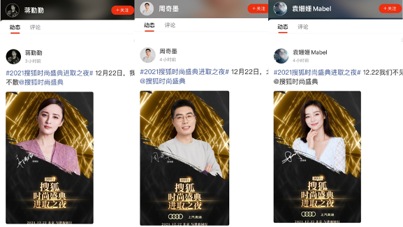 12月22日,2021“搜狐时尚盛典进取之夜”将在北京启幕。盛典进入倒计时,众星纷纷入驻搜狐新闻APP“关注流”,以实时社交互动的方式,与网友分享美照,发布个人时尚宣言,并邀约网友“北京见”“一起进击2022”“不见不散”。明星的入驻,为”关注流”带来一波热潮,也让2021“搜狐时尚盛典进取之夜”实现了极速升温。