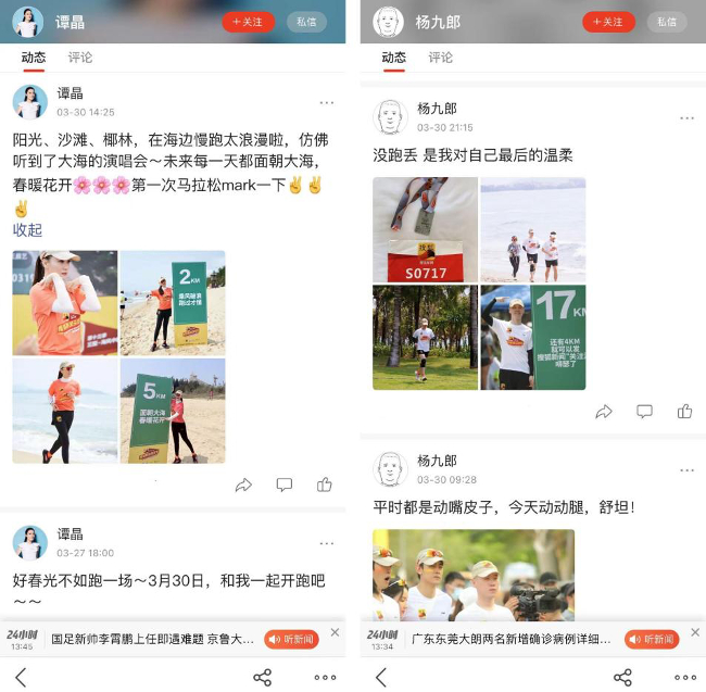 在第十三季“搜狐新闻马拉松”,参加跑步的明星实名注册了“关注流”,以实时社交互动直播的方式,与网友分享精彩自拍照、靓丽跑步视频。谭晶分享了沙滩跑心得:“阳光、沙滩、椰林,在海边慢跑太浪漫了,仿佛听到了大海的演唱会。”杨九郎(“关注流”ID@杨九郎)不改“搞怪”风格,调侃自己:“没跑丢,是我对自己最后的温柔。”张柏芝则晒出美照,并发表动态:“阳光正好,在路上。”吸引大批粉丝夸赞:“我喜欢的美女阳光地回来了!”