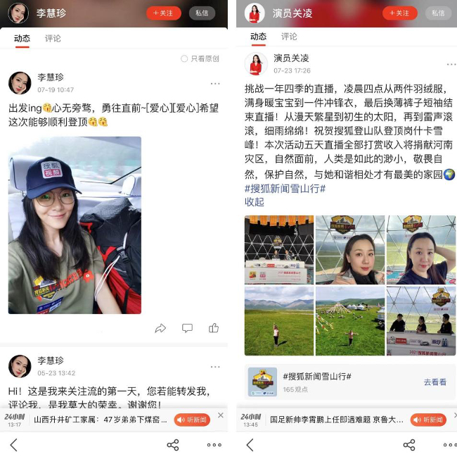 在今年“搜狐新闻雪山行”活动中,众明星将攀登岗什卡雪峰的过程,通过关注流“汇报”给粉丝。李慧珍(“关注流”ID@李慧珍)在出发时鼓励自己:“出发ing,心无旁骛,勇往直前~希望这次能够顺利登顶。”关凌(“关注流”ID@演员关凌)的总结很到位:“挑战一年四季的直播,凌晨四点从两件羽绒服,满身暖宝宝到一件冲锋衣,最后换薄裤子短袖结束直播!从漫天繁星到初生的太阳,再到雷声滚滚,细雨绵绵!祝贺搜狐登山队登顶岗什卡雪峰!”一段话让网友体会到了攀登雪山的艰辛,也体验到人类超越向前的意志。