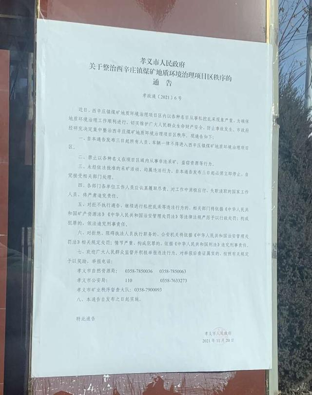 引人注意的是,就在距离盗采点百米开外的杜西沟村村口,还张贴着一份2021年11月20日印发的《孝义市人民政府关于整治西辛庄镇煤矿地质环境治理项目区秩序的通告》,其中写到对拒不执行通告,继续进行私挖乱采等违法行为的,将依法追究相关责任,“对工作中消极应付、失职渎职的国家工作人员,将严肃追究责任。”