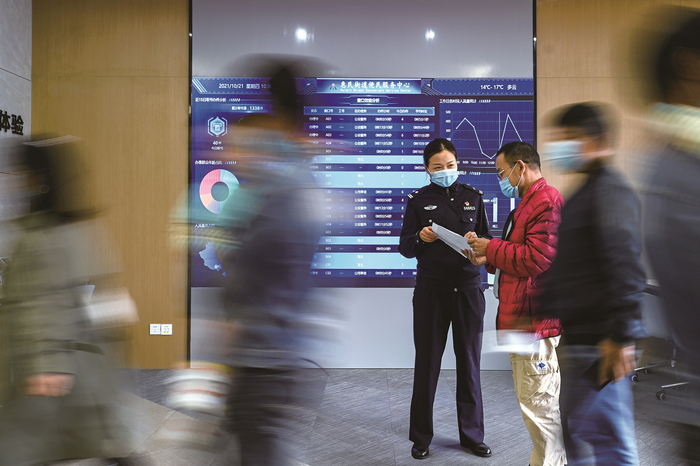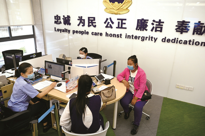 上班前一丝不苟整理着装。“一窗通办”窗口展示的是公安形象。