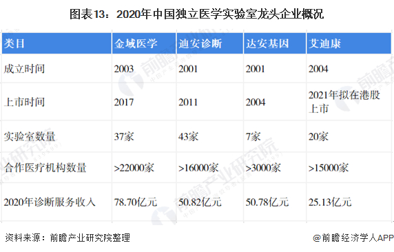 国内独立医学实验室主要集中在迪安诊断、金域、达安、艾迪康四家企业,这四家连锁实验室占据市场绝大部分份额。其中迪安诊断和达安基因成立较早,在“产品+服务”上进行双布局。金域医学作为独立医学实验室的龙头企业,合作医疗机构数量多达2.2万家,2020年诊断服务收入高达78.70亿元。