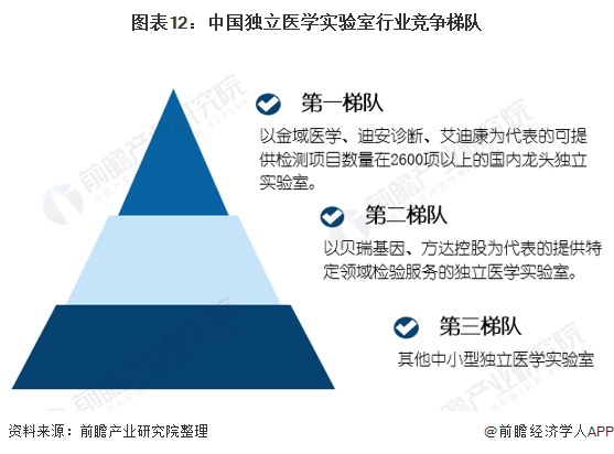 按照检测项目数量以及检测范围来综合划分,我国独立医学实验室第一梯队为以金域医学、迪安诊断、艾迪康为代表的提供检测项目数量在2600项以上的国内龙头独立实验室;第二梯队为以贝瑞基因、方达控股为代表的专精于特定领域检验服务的独立医学实验室;第三梯队为行业内其他中小型独立医学实验室。