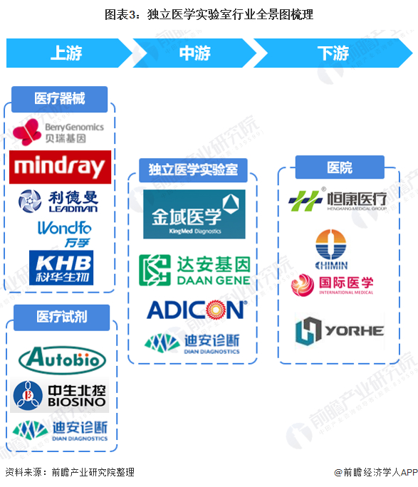 独立医学实验室的上游为医疗器械和医疗试剂,医疗器械的代表性企业为贝瑞基因(000710)、迈瑞医疗(300760)、利德曼(300289)、万孚生物(300482)和科华生物(002022);医疗试剂的代表性企业为安图生物(603658)、中生北控(08247)以及迪安诊断(300244);中游为独立医学实验室,目前行业中的龙头企业有迪安诊断(300244)、达安基因(002030)、金域医学(603882)、艾迪康;下游医院有ST恒康(002219)、济民医疗(603222)、国际医学(000516)和永和智控(00275)。