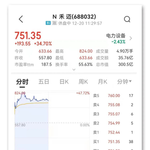 A股史上最贵新股禾迈股份今日上市,发行价为557.80元/股,开盘涨13.6%,股价报633.66元/股。开盘后股价继续拉升,盘中涨47.72%触发临停,报824元/股,中一签(500股)最多可赚13.31万元。