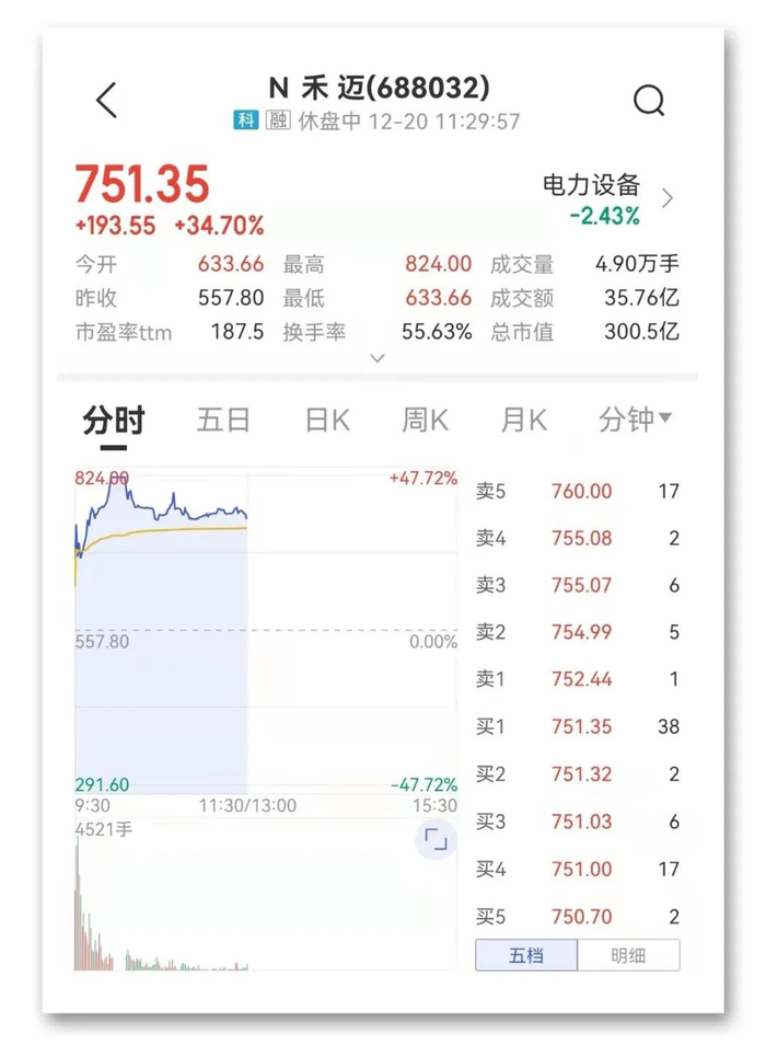 今日上午,A股史上最贵新股禾迈股份盘中涨47.72%触发临停,报824元/股,中一签(500股)最多可赚13.31万元。