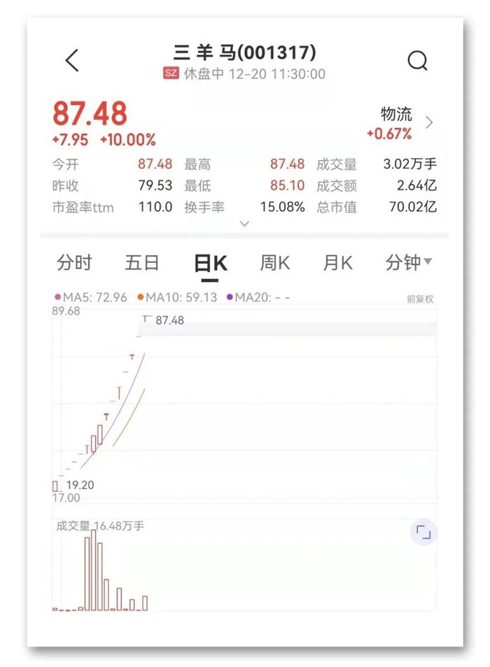 次新物流股三羊马今日上午继续涨停,上市以来已斩获15连板。公开资料显示,三羊马是一家主要通过公铁联运方式为汽车行业和快速消费品行业提供综合服务的第三方物流企业。当前,公司超85%的营收来自于汽车物流业务。